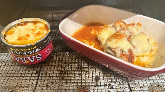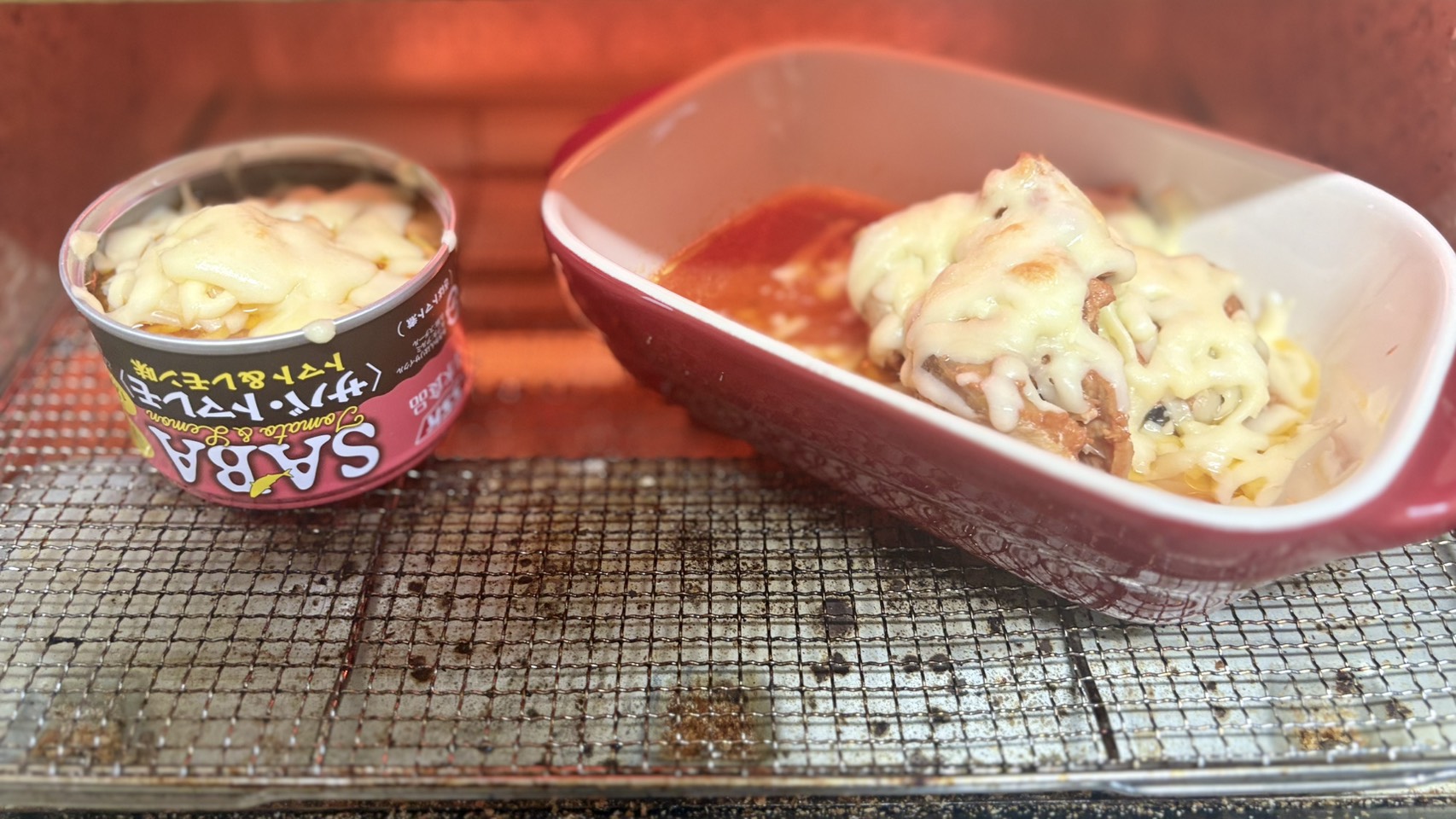 ・同じサバ缶が2つあったので、一つはグラタン皿にあけて、一つは缶のまま焼きました。同じ時間焼いたのですが、皿にあけた方がよりアツアツになりました。「缶のままアツアツにしたい!」という方は、チーズをのせる前にサバ缶だけオーブンで加熱→汁がブクブクしてきたらチーズをのせさらに加熱、という方法をとるといいと思います。